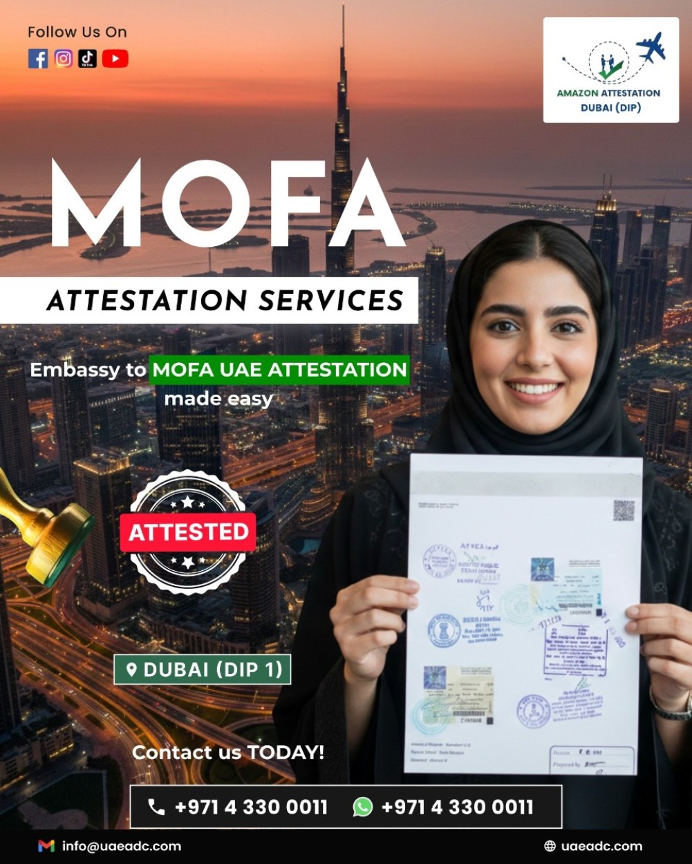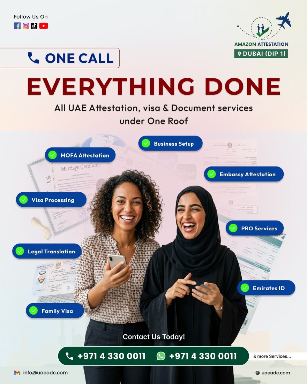 Amazon Attestation & Documents Clearing Services offers complete, fast, and reliable document solutions across the UAE. From MOFA, Embassy, MOJ, MOE, KHDA attestation to visa processing, business setup, PRO services, legal translation, and more — we handle everything under one roof. Our expert team ensures accurate processing, quick turnaround, and stress-free service for individuals and businesses. Your trusted partner for all UAE documentation needs.