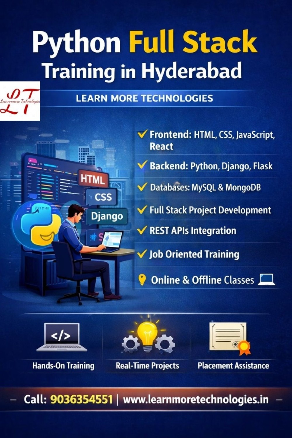 Build a powerful career in web development with Python Full Stack Training in Hyderabad at LearnMore Technologies. This course covers front-end technologies (HTML, CSS, JavaScript), back-end development using Python (Django/Flask), databases (SQL), and real-time project development. Gain hands-on experience through live sessions led by industry experts. We also provide certification guidance and placement support to help you land top IT jobs. Enroll now to become a job-ready full stack developer.