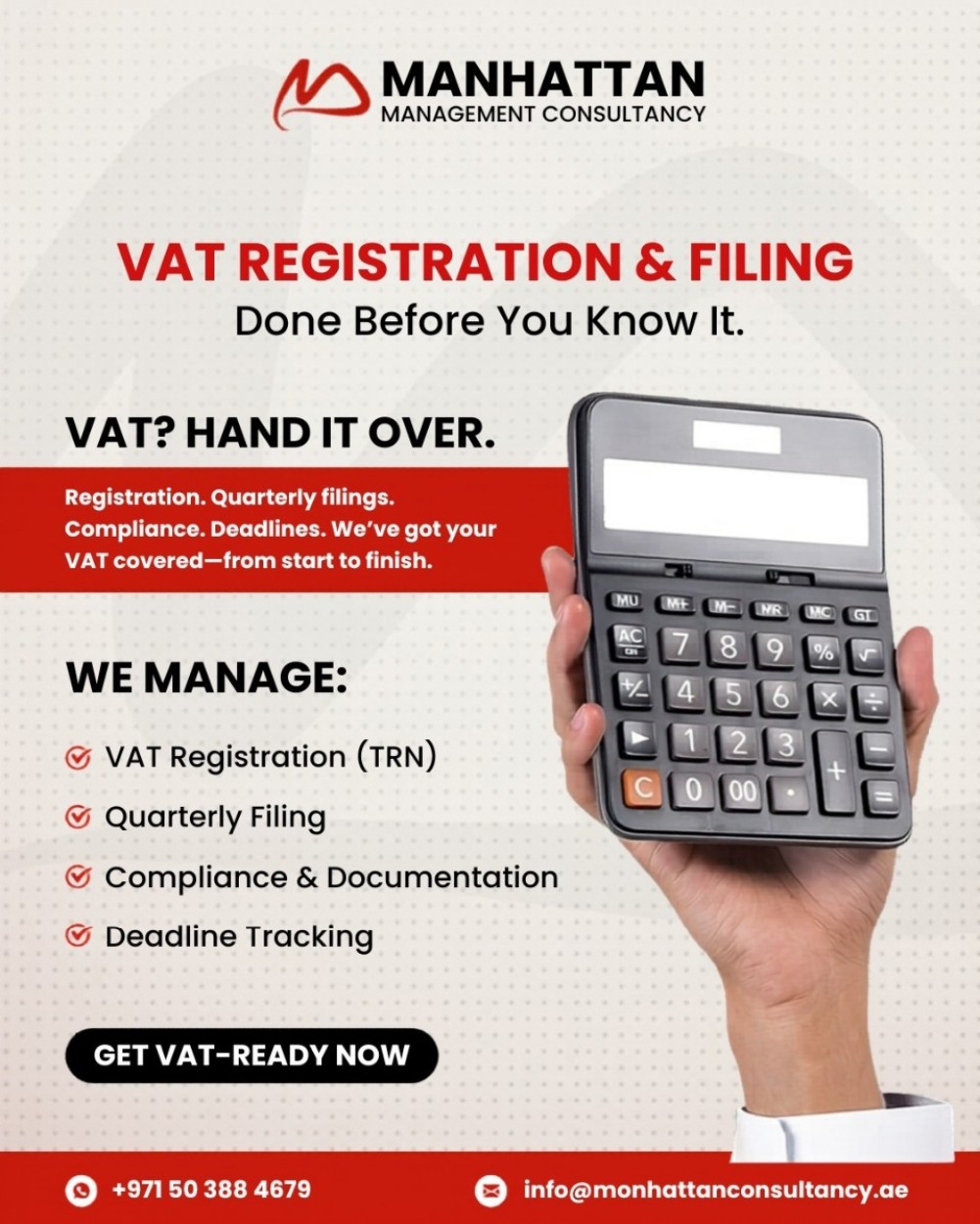 We also specialize in VAT registration, corporate tax services, and ongoing compliance support, ensuring your business adheres to all UAE regulations. From initial setup to long-term business support, Manhattan Management Consultancy is your trusted partner for seamless, reliable, and growth-focused solutions.
