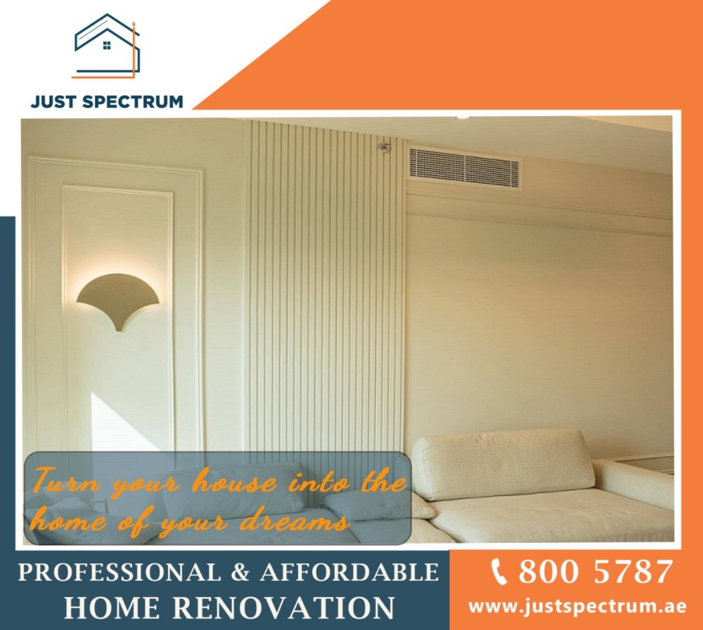 Transform your living space with professional and affordable home renovation services in Dubai. Whether you're looking to upgrade your interiors, create more functional layouts, or modernize your home with stylish designs, our team is here to make your vision a reality. From concept to completion, we deliver high-quality craftsmanship, innovative solutions, and personalized touches tailored to your needs and budget. With a focus on detail, efficiency, and customer satisfaction, we ensure a seamless renovation experience that enhances your home’s comfort, style, and value. Let us help you redefine your space—affordably and professionally! Choose excellence. Choose Just Spectrum.