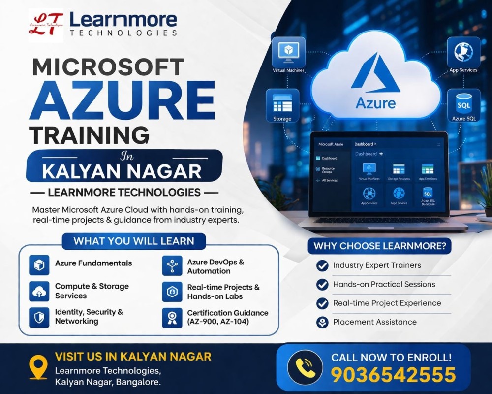 Step into the world of cloud computing with Microsoft Azure Training at Learnmore Technologies, Kalyan Nagar. This industry-focused program is designed to help students and professionals gain hands-on expertise in Azure cloud services, virtual machines, storage, networking, and security.