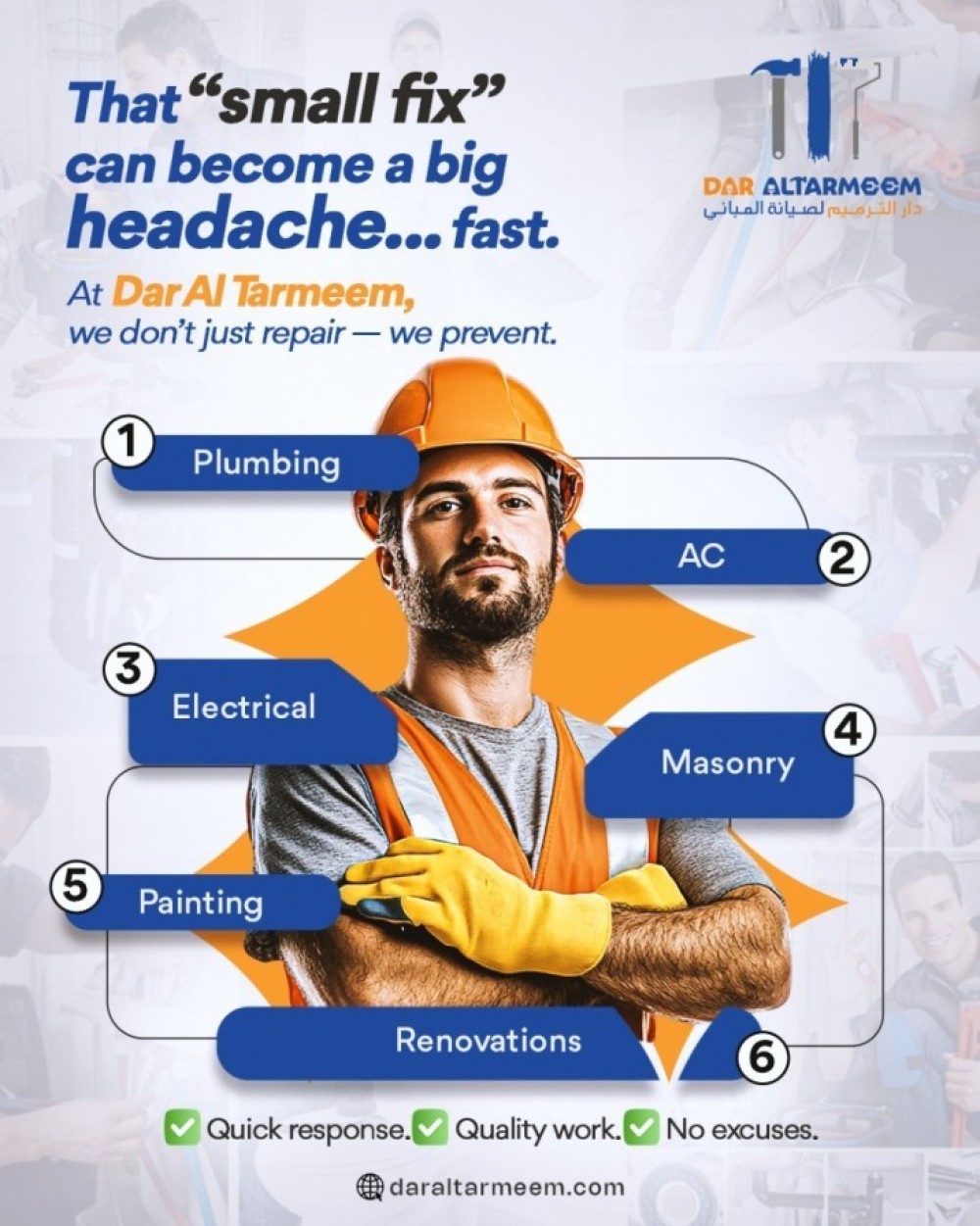 Looking for trusted plumbing services or expert apartment maintenance in Dubai or Sharjah? Dar Al Tarmeem offers fast, professional solutions for all your plumbing needs. From fixing leaks and clogs to full maintenance, our experienced plumbers ensure quality repairs with no hidden fees.