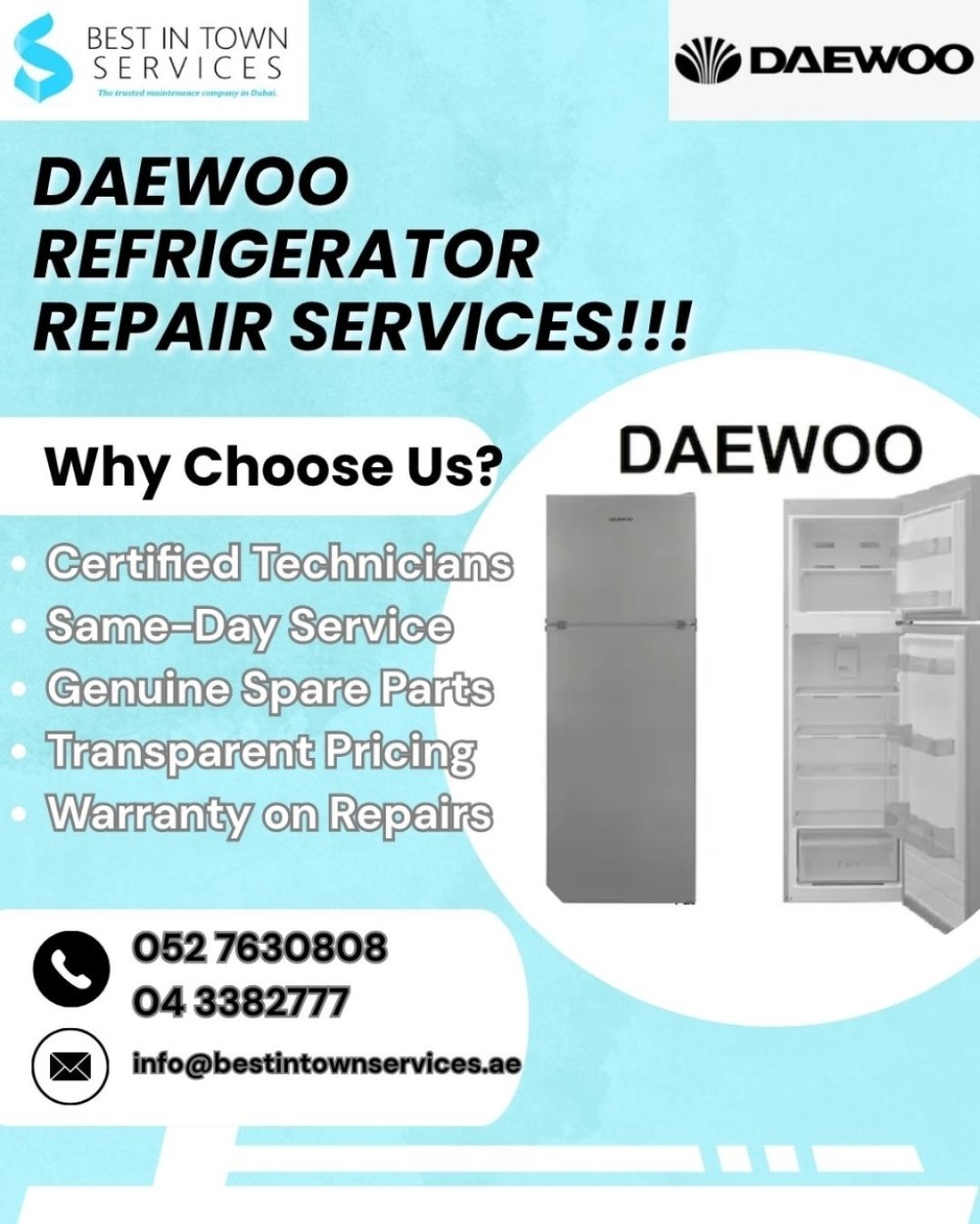 ❄️ Daewoo Refrigerator Repair Services – Dubai Is your Daewoo fridge acting up? We offer expert repair and maintenance for all Daewoo refrigerator models—ensuring your appliance runs smoothly, efficiently, and reliably in Dubai’s demanding climate.