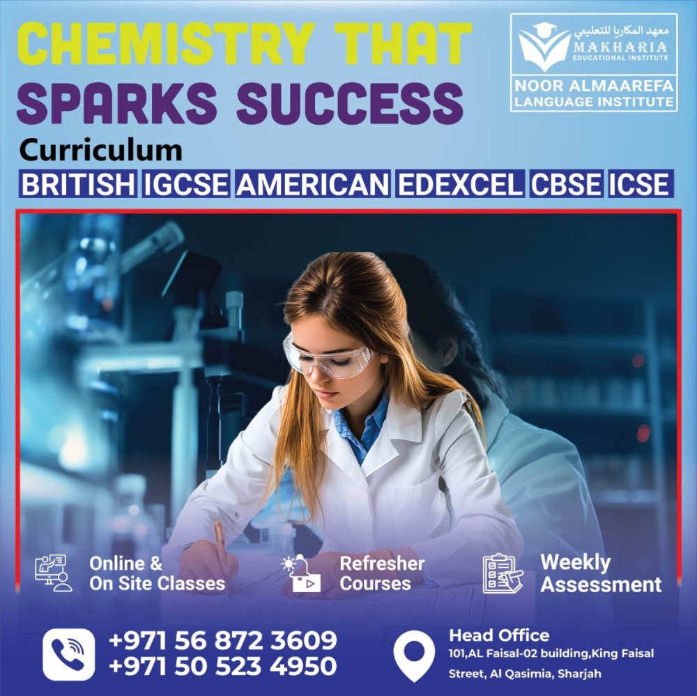 Join Makharia Institute, the leading Chemistry tuition center in Al Qasimia, Sharjah, and take your learning to the next level. Whether youβre in Grade 9β12, CBSE, IGCSE, or Foundation Courses, our expert tutors make Chemistry simple, clear, and fun.