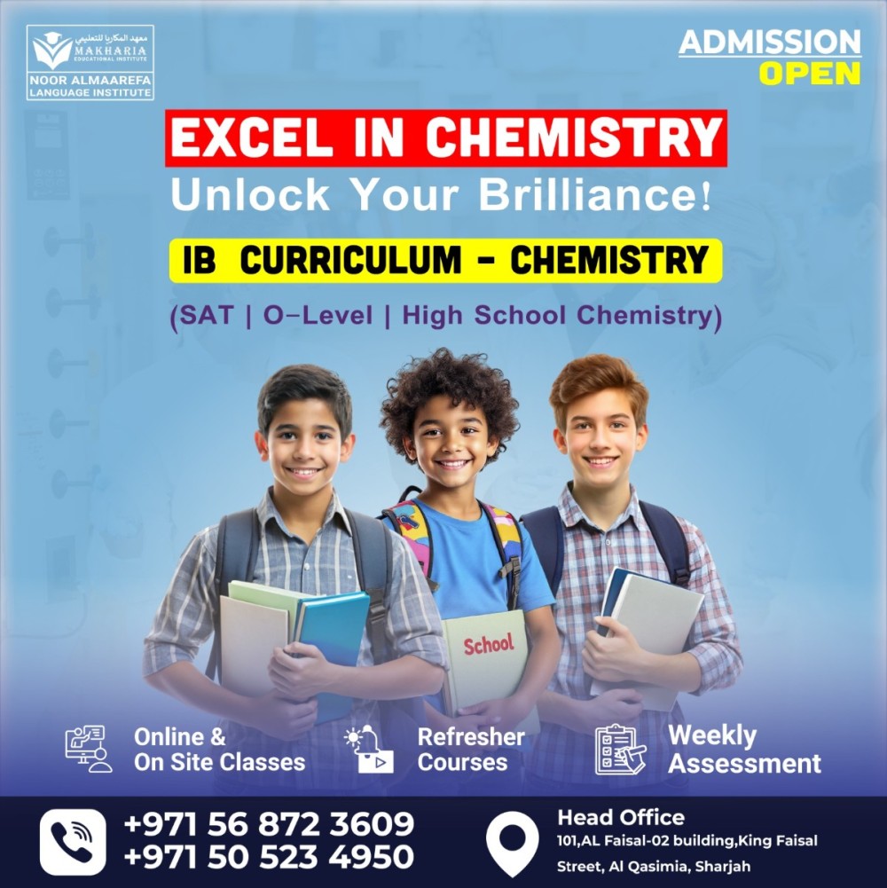 At Makharia Institute, located in Al Qasimia, Sharjah, we provide high-quality Chemistry tuition to help students excel academically. Our programs cover the IB Curriculum, SAT Chemistry, O-Level, and High School Chemistry, ensuring every learner gains a strong foundation and exam confidence.