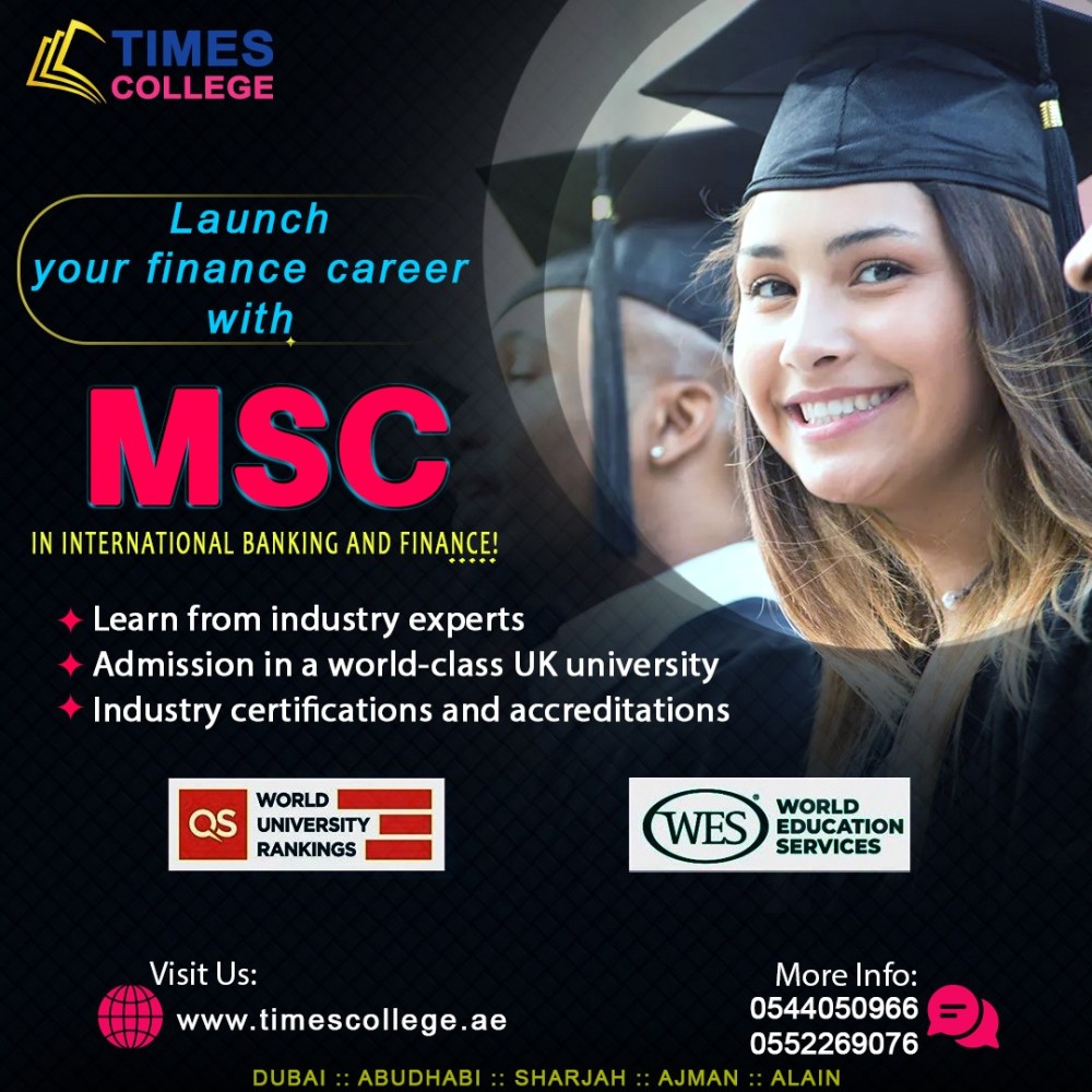 Enhance your financial knowledge with an MSc in Banking and Finance in Dubai at Times College. This program offers a blend of academic rigor and practical experience, preparing you for lucrative roles in the finance sector.