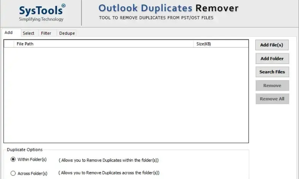 SysTools Outlook Duplicate Remover tool is a powerful utility designed to automatically find and remove duplicate emails, contacts, calendars, and other mailbox items from Outlook. It ensures complete data accuracy while cleaning duplicates from PST, OST, and BAK files. The tool offers options to compare data within or across folders and supports advanced filters for precise results. Compatible with all Outlook versions, it helps users maintain a clutter-free and efficient mailbox.