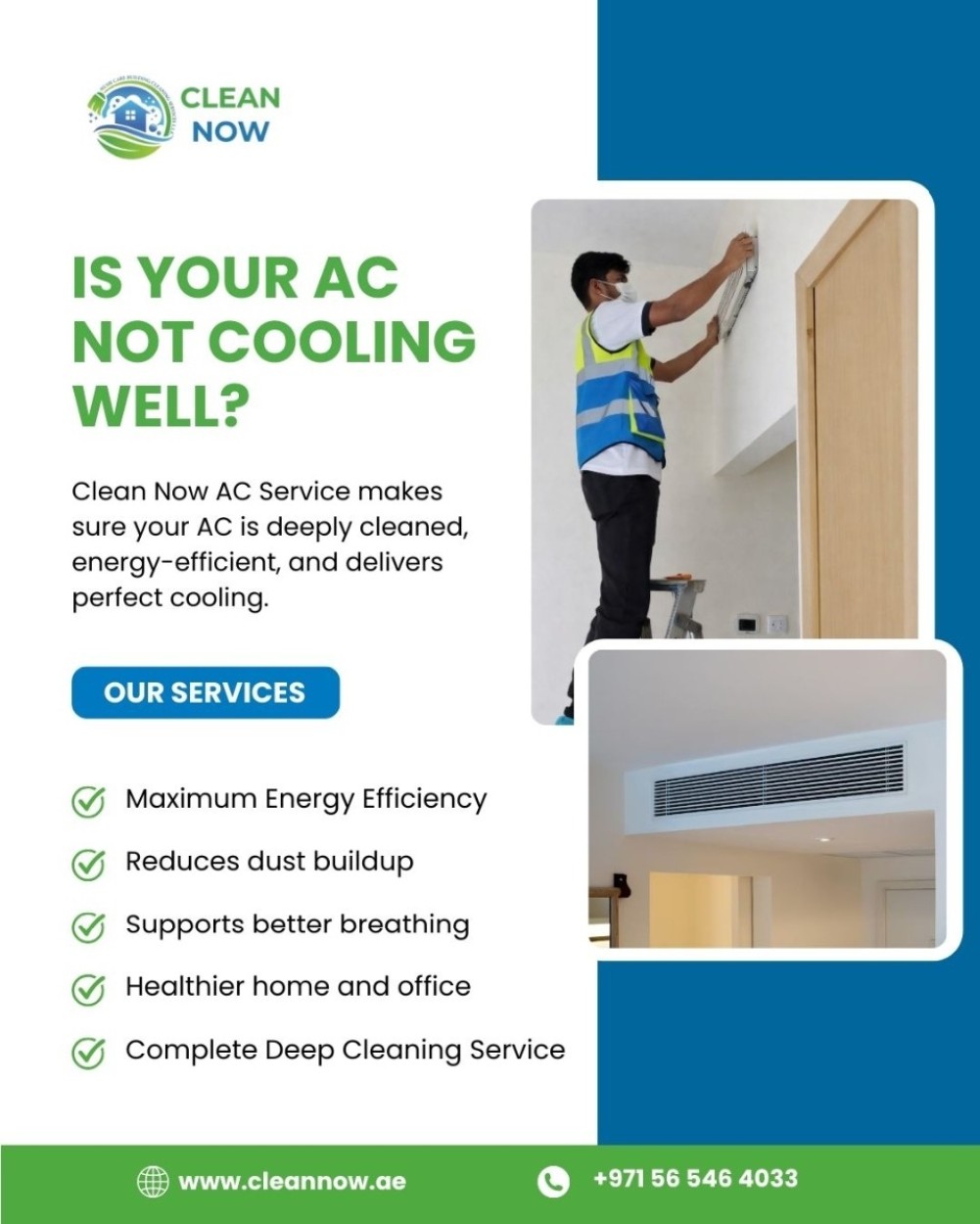 Clean Now AC Service provides professional AC Duct Cleaning in Dubai to ensure your system is deeply cleaned, energy-efficient, and delivers powerful, fresh cooling.