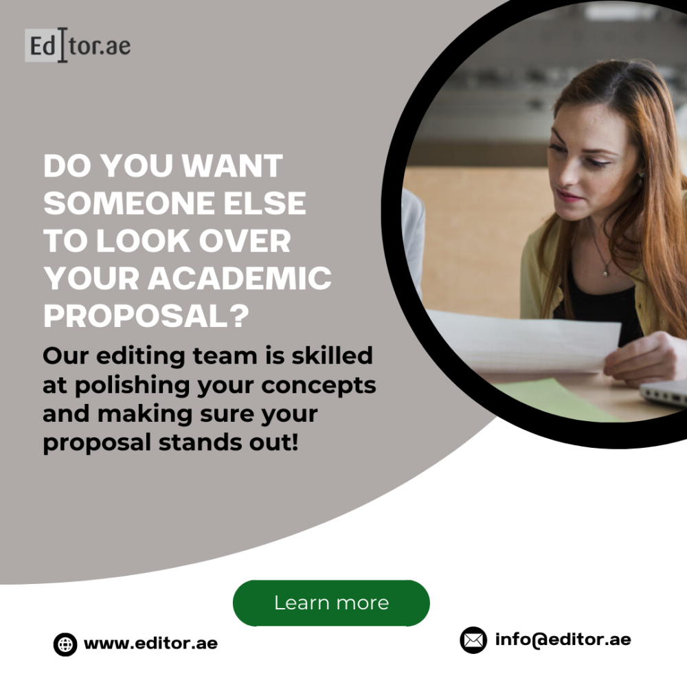 Seeking perfection in your academic proposal? Our expert editing team at Editor UAE is here to boost your ideas to new heights. Whether it's refining your concepts or ensuring flawless presentation, we specialize in making your proposal shine.