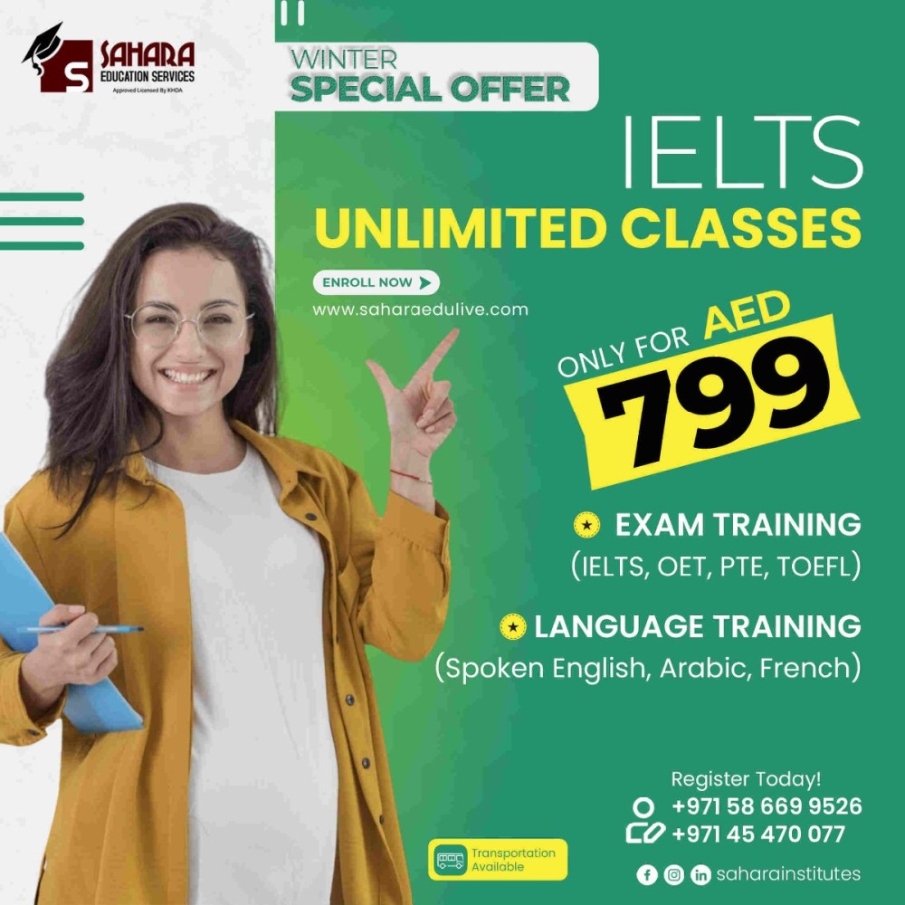 Boost your IELTS score with Sahara Education Institute in Al Nahda, Dubai only for 799 AED , unlimited class ! Our expert trainers provide top-notch IELTS preparation, coaching, and classes to help you excel. Join the best IELTS institute in Al Nahda and achieve your dream score!