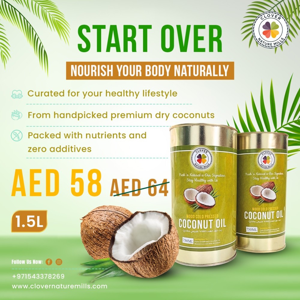 Get the purest and healthiest cold pressed coconut oil at a special price! Buy our Cold Pressed Coconut Oil Combo Pack (2 x 750ml) now for just AED 58 (originally AED 64). Perfect for cooking, hair care, and skincare, our organic coconut oil is loaded with nutrients that support a healthy lifestyle.