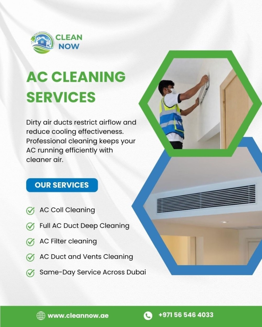 Dust, dirt, and clogged ducts can reduce airflow and cooling efficiency. Regular AC cleaning helps maintain smooth performance, improves air quality, and supports energy efficiency for homes and offices.