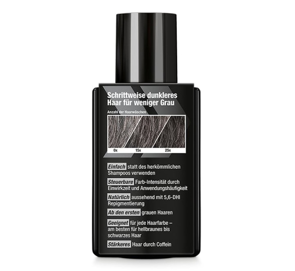 The innovative repigmentation technology is based on a patent-pending formula: the active ingredient 5,6-DHI accumulates in the hair during shampooing and reacts with the oxygen in the air to form the color pigment. As a result, the hair tone gradually becomes darker. A permanent hair color develops that grows out with the hair.