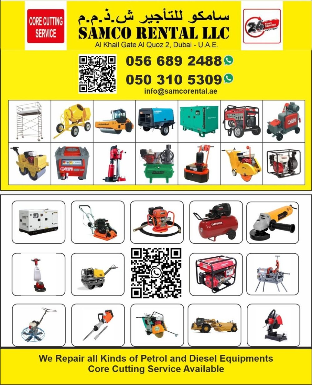 Welcome to SAMCO SQUARE EQUIPMENT RENTAL LLC, a Power Equipment Rental agency in Dubai, where we cater to maintenance companies, MEP (Mechanical, Electrical, and Plumbing) contractors, fire and safety professionals, road construction firms, and building construction companies. With a wide range of high-quality equipment available for rent and expert repair services, we are dedicated to supporting the essential work of these industries. We understand the importance of reliable equipment in ensuring the success and safety of your projects, and we are grateful for the opportunity to serve you. Thank you for choosing us as your trusted partner. Visit us at samcorental.ae for more information about our services. For any inquiries, feel free to contact us at +971566892488. Don’t forget to follow our Instagram page at https://www.instagram.com/samcorentalequipments/ to stay updated with our latest news and offerings!