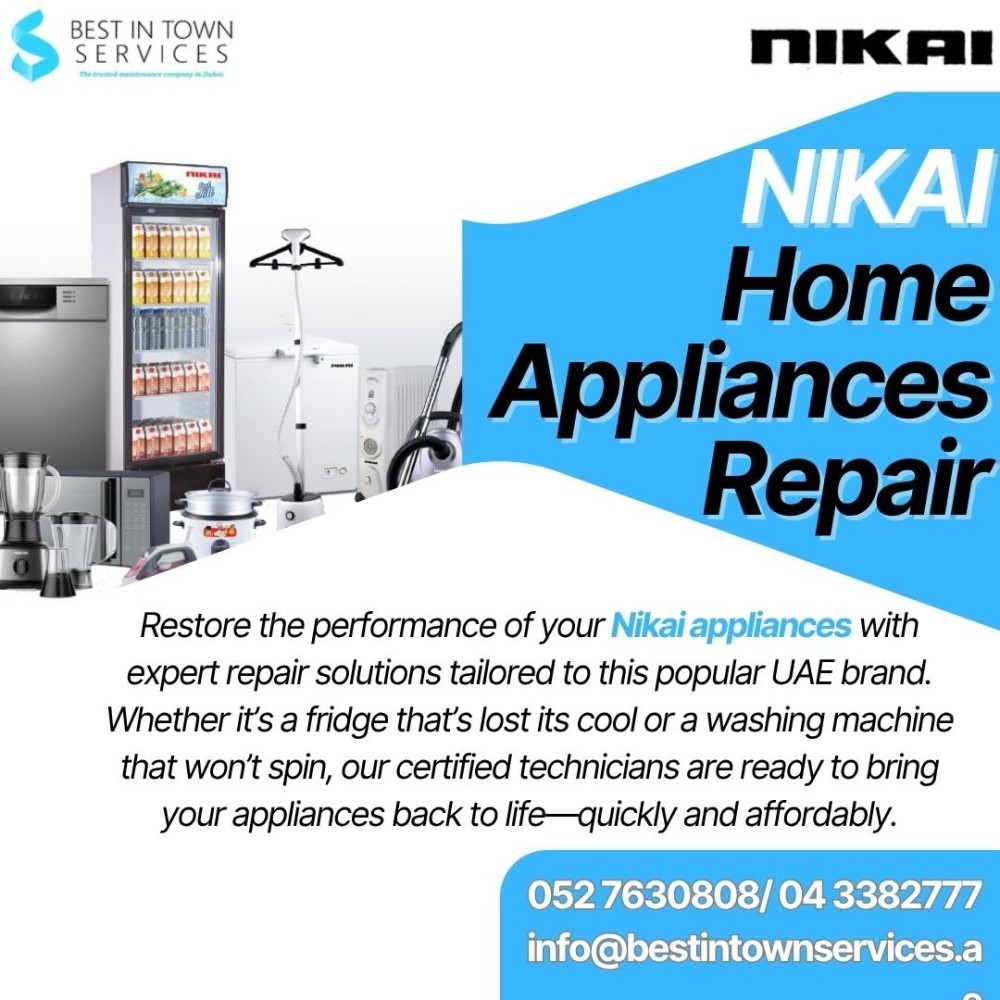 🛠️ Nikai Appliance Repair Services – Trusted Care for Every Home Restore the performance of your Nikai appliances with expert repair solutions tailored to this popular UAE brand. Whether it’s a fridge that’s lost its cool or a washing machine that won’t spin, our certified technicians are ready to bring your appliances back to life—quickly and affordably.