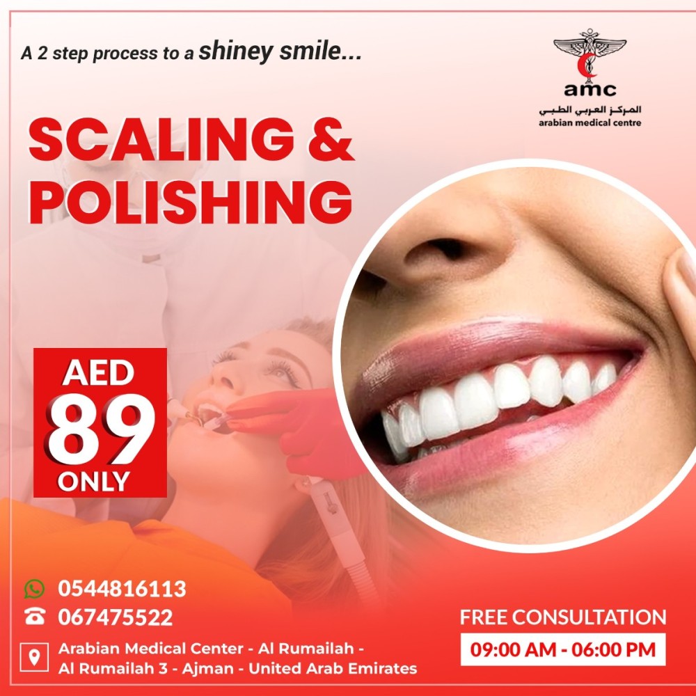 Reach out to Arabian Medical Centre today to schedule your appointment for scaling and polishing, priced at an affordable 89 AED. Keep oral problems at bay and embrace a healthier, more radiant smile! What's more, enjoy a complimentary consultation between 9 a.m. and 6 p.m. to discuss your dental needs.