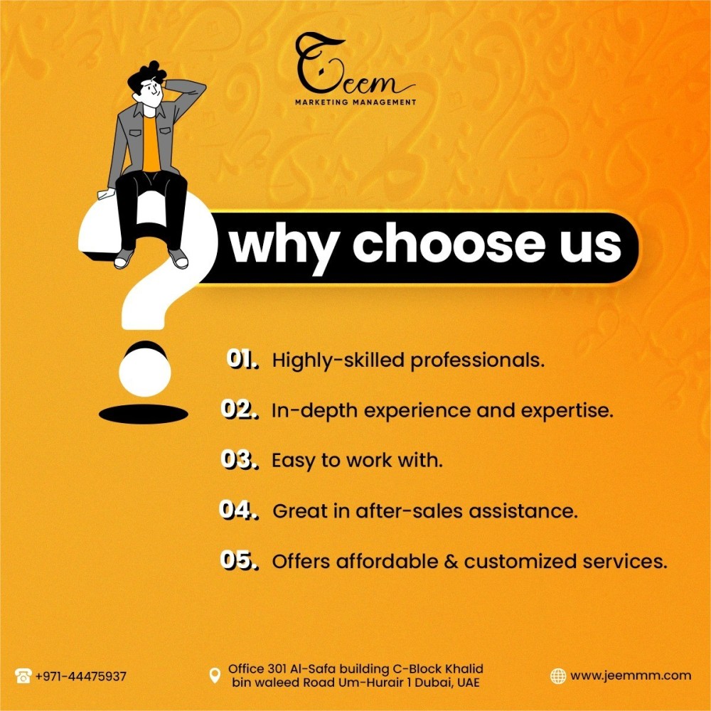 "Jeem Marketing Management is a name of excellence in the UAE digital world. As a top-tier Digital Marketing Agency in Dubai, we deliver customized solutions to promote your brand's online presence.Our extensive services include content and influencer marketing, branding and strategy, graphic design, website development, SEO, & more.This Digital Marketing Agency in Dubai crafts the best marketing strategies that meet the needs of your targeted audience and drive actual results. We focus on trends, innovation, and creativity to make your brand stand out in the competitive digital landscape. Experience the difference with Jeem Marketing, your trusted partner in achieving digital success."