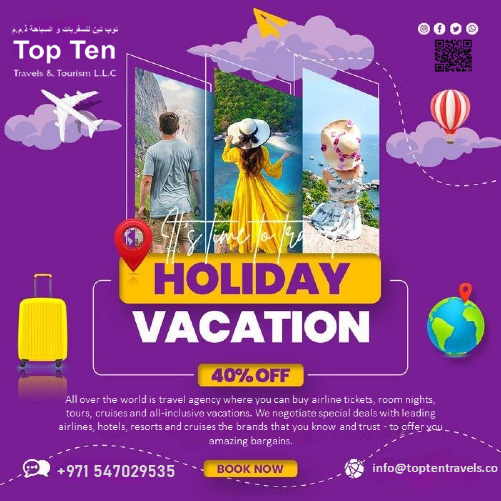 Topten Travels is a leading online travel company that offers personalized and hassle-free travel experiences to customers around the world. Whether you are looking for a romantic getaway, a family vacation, a business trip, or a solo adventure, Topten can help you find and book the best deals on flights, hotels, car rentals, cruises, and more. Topten also provides you with access to exclusive offers, discounts, and rewards through its loyalty program and partnerships with top travel brands. With Topten, you can plan your dream trip with just a few clicks and enjoy 24/7 customer support and assistance throughout your journey. Topten is your one-stop shop for all your travel needs. Contact us +971 547029539,547029535 Email- info@toptentravels.co