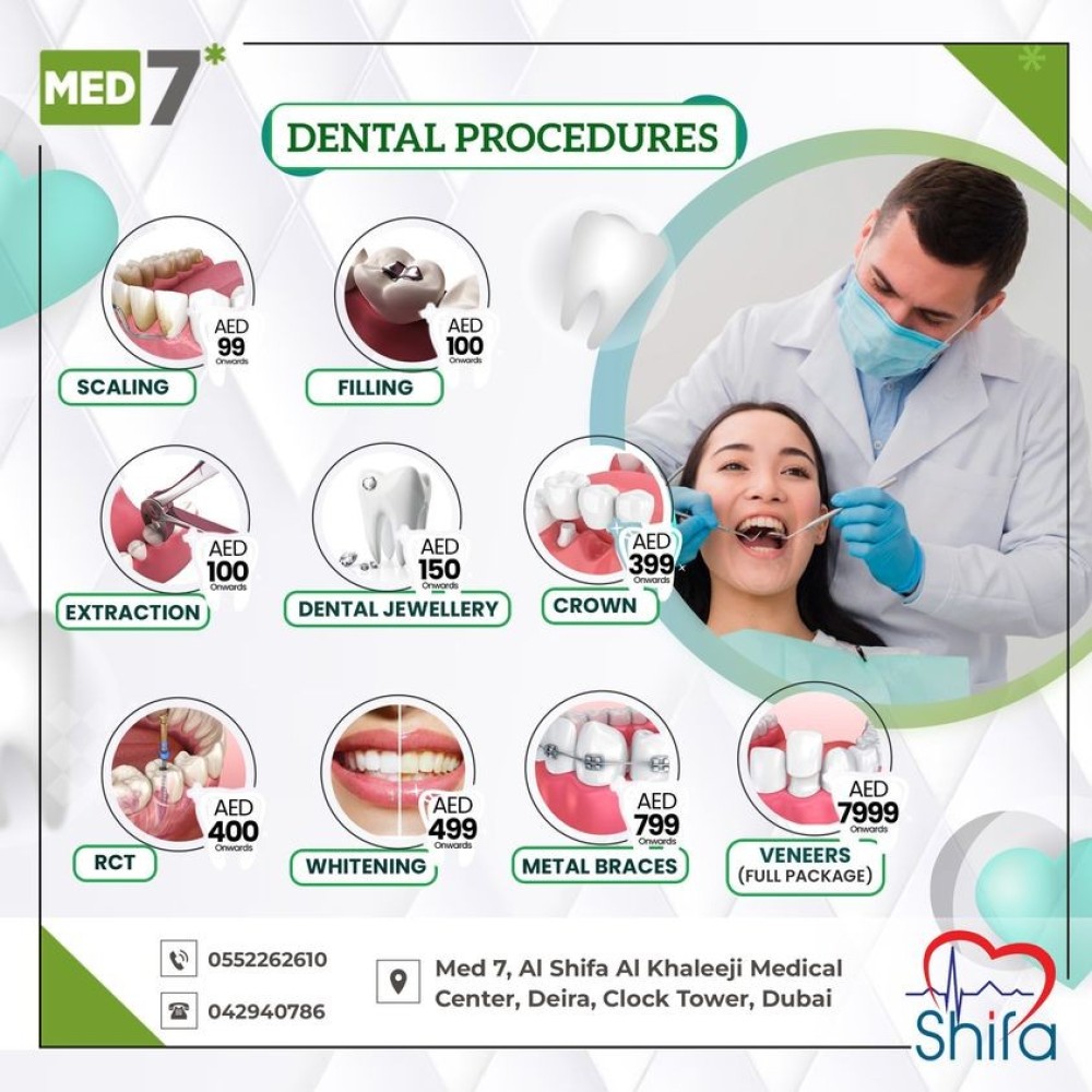 Description: Join the thriving community of Deira, Dubai, in experiencing a decade of exemplary dental care at Al Shifa Al Khaleeji Medical Center! Our comprehensive range of services includes Scaling, Filling, Extraction, Dental jewelry installation, Crown fitting, Root canal treatment (RCT), Teeth whitening, Metal braces installation, and Veneers. Entrust us with your dental health, and embark on a journey towards a confident, radiant smile. Your satisfaction and well-being are our top priorities. Visit us today and discover the difference!
