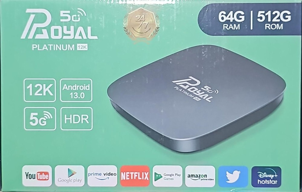 5G Royal Platinum android box 64GB Ram 512GB Rom with One year subscription all world channels available.