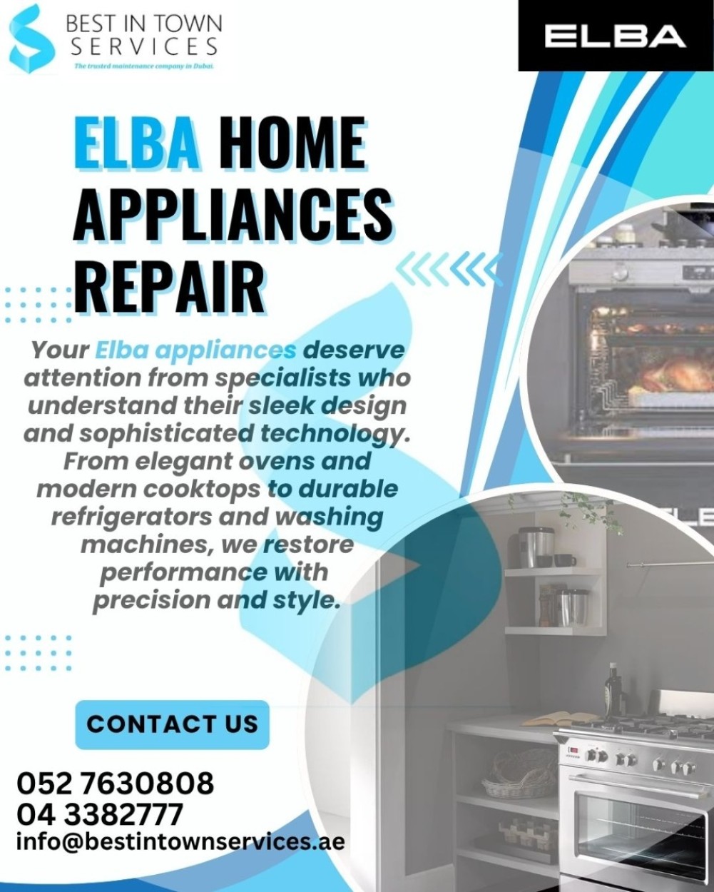 Is your Elba appliance giving you trouble? Don’t stress β€” Best in Town Services is here to help! We specialize in repairing all Elba home appliances, including ovens, cooking ranges, refrigerators, washing machines, dryers, dishwashers, and more.