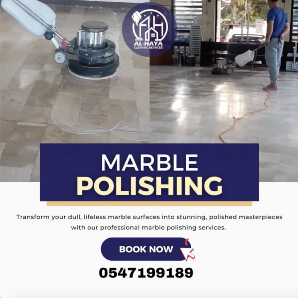 Al Haya cleaning services is providing all type marble polishing, granite polishing, quartzite polishing and all kind of natural stone restoration and polishing services to recover the shine and luster of marble surfaces. The process generally involves honing, grinding, polishing, crystallization the marble surface to a glossy finish.