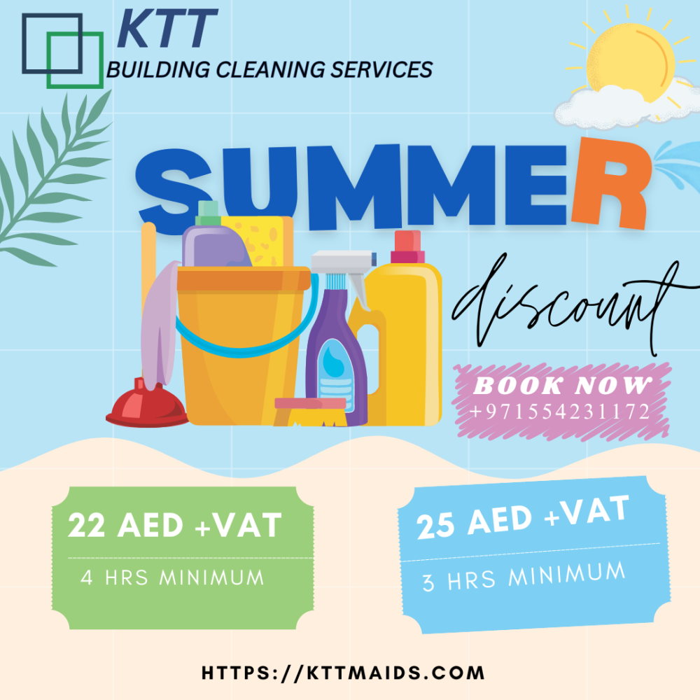 Get KTT cleaning services Affordable and hassle-free! We have special offer for summer @22 AED + VAT per hour for 4hours without materials @25+VAT per hour for 3hours with out materials