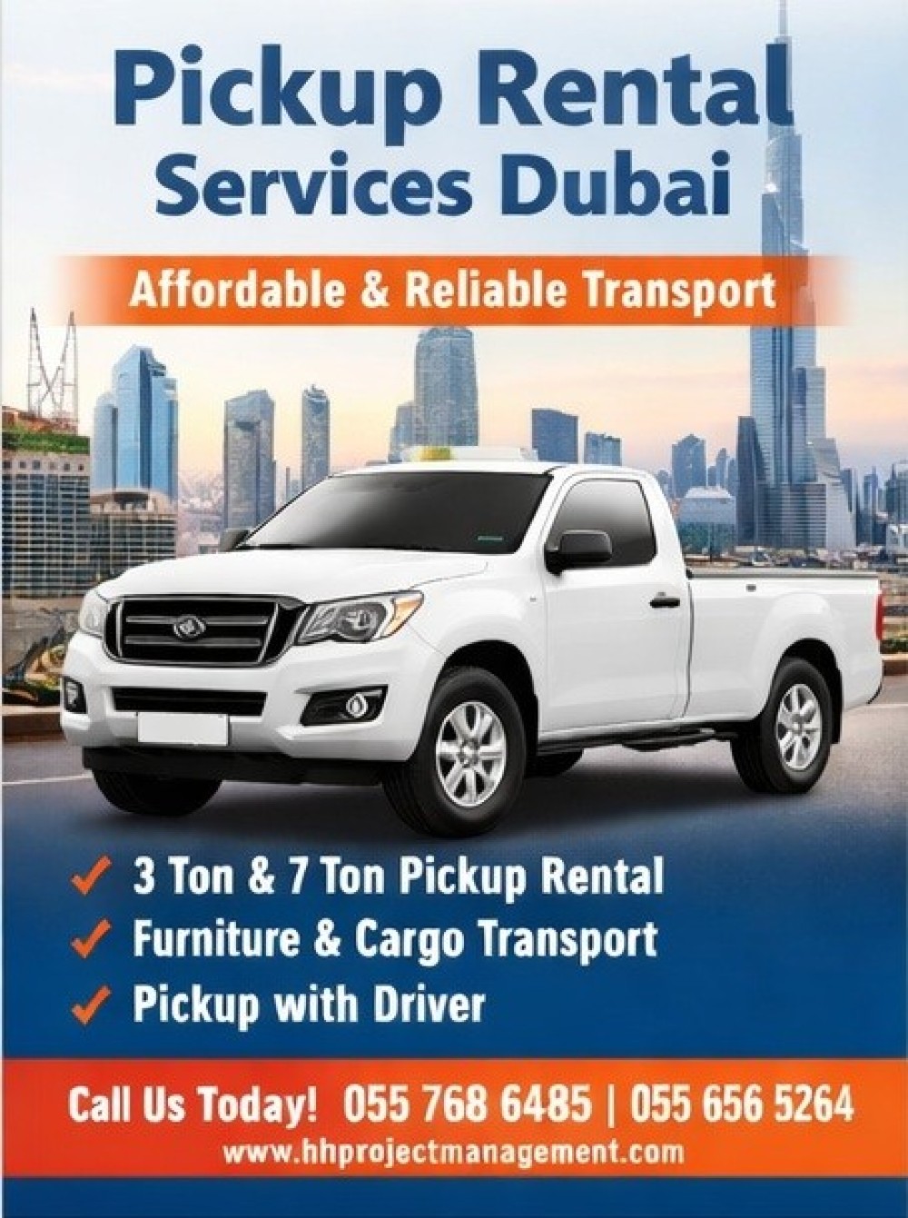 Looking for pickup truck rental Dubai? HH Project Management offers professional, affordable, and reliable pickup truck rental services in Dubai for residential, commercial, and industrial transportation needs. Whether you need a pickup for furniture moving, office shifting, or cargo delivery, we provide well-maintained trucks with experienced drivers available 24/7.