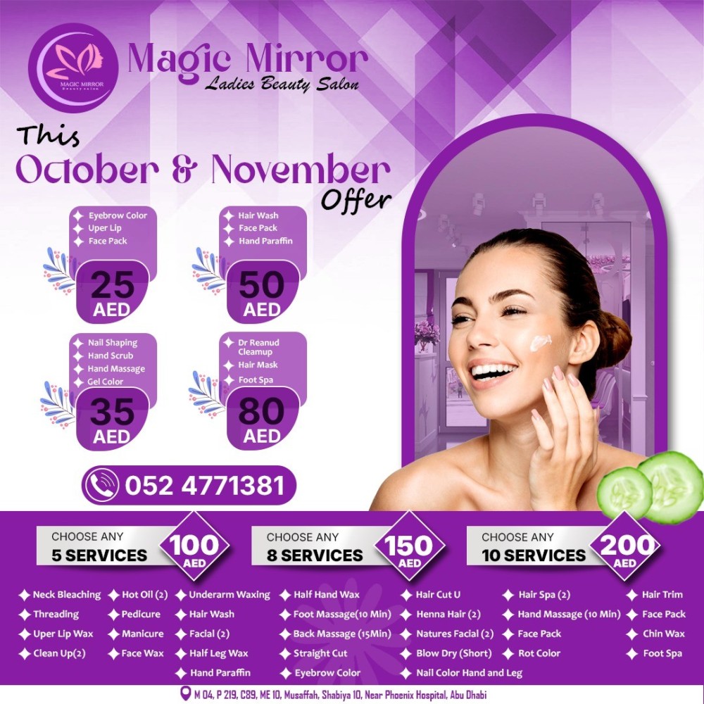Located in the heart of Mussafah, Magic Mirror Ladies Beauty Salon offers an exquisite range of services to help you look and feel your best. With a focus on luxurious treatments, the salon provides a relaxing ambiance where clients can unwind and enjoy a personalized beauty experience.