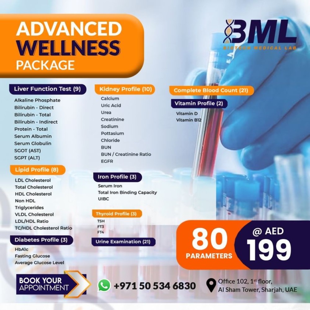 Prioritize your well-being with our state-of-the-art Advanced Wellness Package, meticulously designed by Biotech Medical Lab. Uncover insights into your health with an extensive analysis of 80 parameters, providing a comprehensive overview of your body's vital functions.