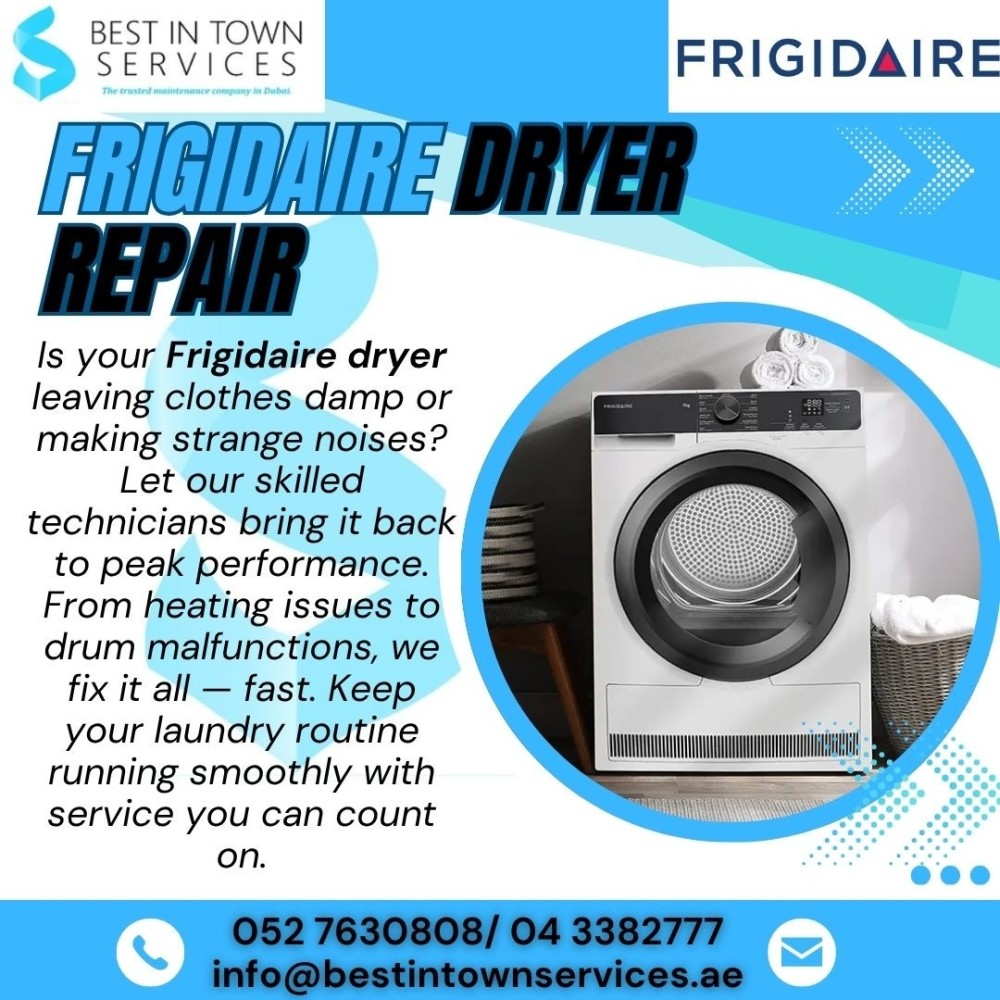 Is your Frigidaire dryer not heating, taking too long to dry, or making unusual noises? 🧺 Don’t stress — Best in Town Services brings your laundry days back to life with expert Frigidaire dryer repair across Dubai! 💨✨