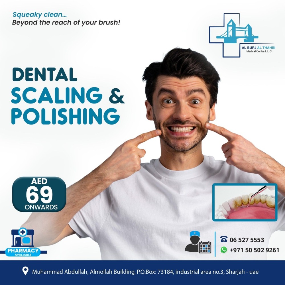 Rejuvenate your smile with our Scaling and Polishing service. Book your appointment now at Al Burj Al Thahbi Medical Center!