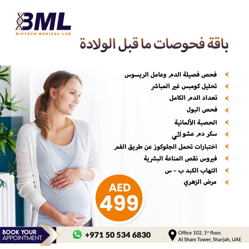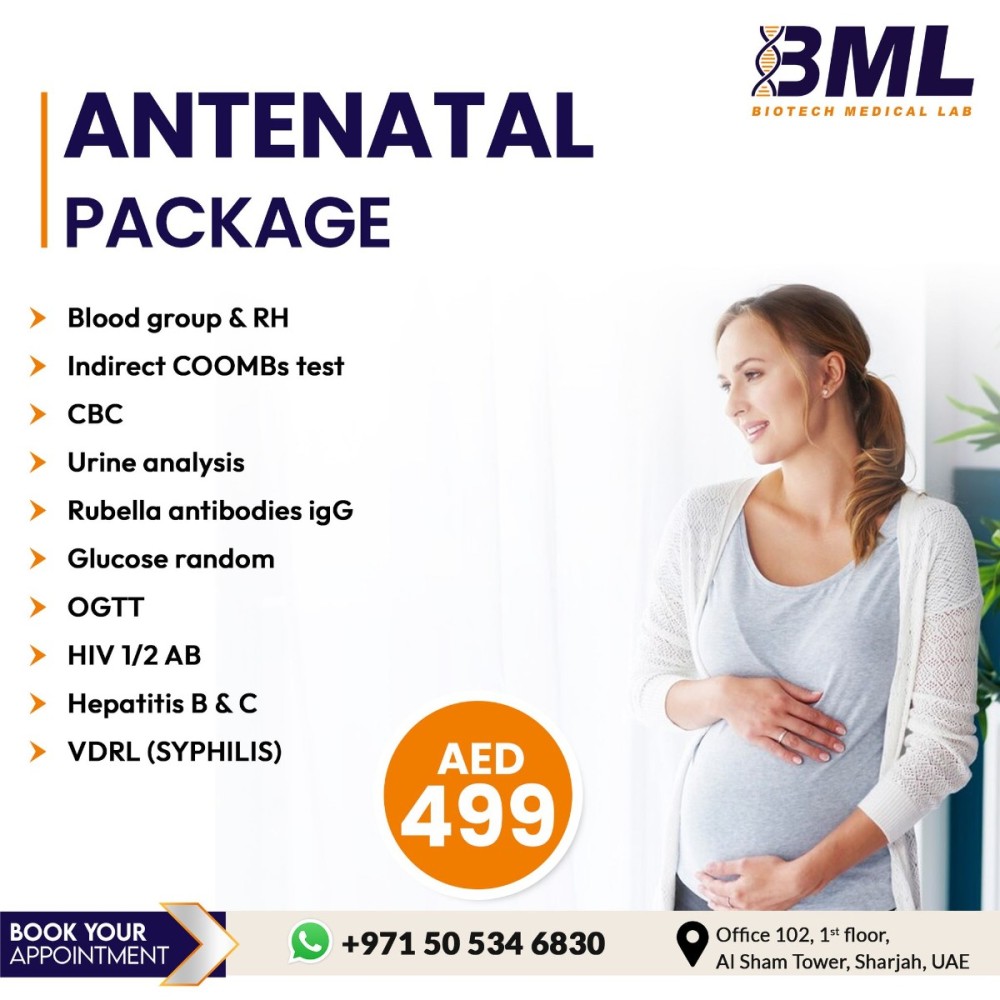Embarking on the journey of pregnancy? Safeguard the well-being of both you and your baby with BML's Antenatal Package, specifically designed to identify potential complications arising from blood incompatibilities, antibodies, and Rh factors. Trust the most experienced and trusted medical lab in Sharjah for comprehensive antenatal blood tests, priced at just 499 AED.