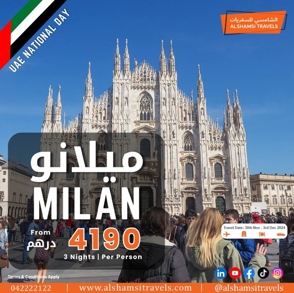 Explore Milan with Al Shamsi Travels – UAE National Day Special! ✈️✨ Looking for the best travel agency in Dubai or a travel agency near by me? Al Shamsi Travels has an exclusive offer for a memorable Milan getaway starting from just AED 4190 for 3 nights per person!